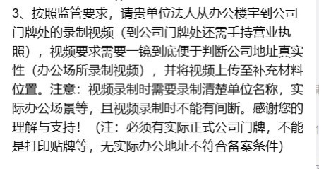 按照監(jiān)管要求,請貴單位法人從辦公樓宇到公司門牌處的錄制視頻(到公司門牌處還需手持營業(yè)執(zhí)照),視頻要求需要一鏡到底便于判斷公司地址真實性(辦公場所錄制視頻),并將視頻上傳至補(bǔ)充材料位置。注意:視頻錄制時需要錄制清楚單位名稱,實際辦公場景等,且視頻錄制時不能有間斷。感謝您的理解與支持!(注:必須有實際正式公司門牌,不能是打印貼牌等,無實際辦公地址不符合備案條件)。