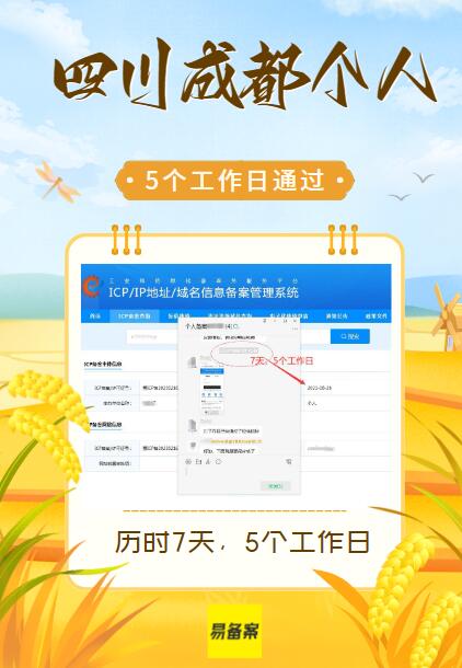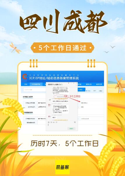 最近做了兩個四川省成都市的備案,兩個備案一個是企業(yè)的,一個是個人的。都是5個工作日備案通過。速度上不錯,比以前更快一些了。用7天,5個工作日審核通過,這個效率不低。