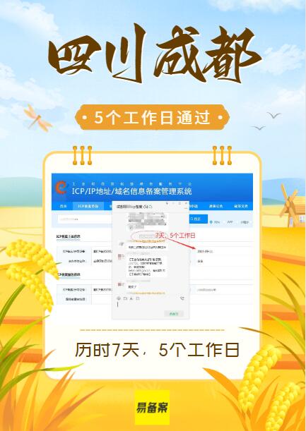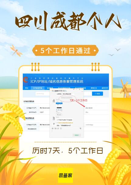 我們最近做了兩個(gè)四川省成都市的網(wǎng)站ICP備案,一個(gè)企業(yè)的一個(gè)個(gè)人的。時(shí)間上都差不多,7天個(gè)工作日。相對(duì)來說,四川能有這樣的速度,還是很好的,相當(dāng)快了!全國一般是6、7個(gè)工作日比較多一點(diǎn)。以前四川要八九個(gè)工作日,現(xiàn)在速度上有提升。