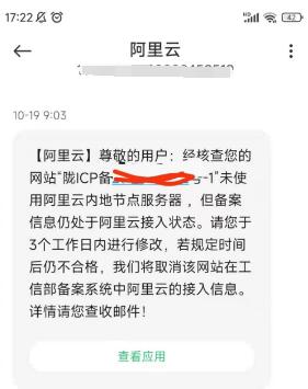 有客戶咨詢,收到了阿里云的提示短信,說是沒有使用阿里云內地節(jié)點服務器:【阿里云】尊敬的用戶:經核查您的網站“隴ICP備-xxxxxxx”未使用阿里云內地節(jié)點服務器,但備案信息仍處于阿里云接入狀態(tài)。請您于3個工作日內進行修改,若規(guī)定時間后仍不合格,我們將取消該網站在工信部備案系統(tǒng)中阿里云的接入信息。詳情請您查收郵件!短信如下: