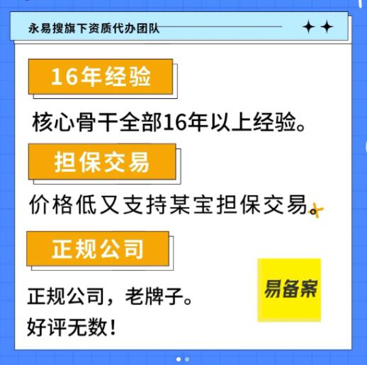 易備案是我公司永易搜旗下專(zhuān)業(yè)的代辦資質(zhì)團(tuán)隊(duì),是我們的子品牌。公司核心員工有16年的工作經(jīng)驗(yàn),因?yàn)槲覀冏鼍W(wǎng)站都是要給客戶(hù)做備案的,這個(gè)流程一直都要做。