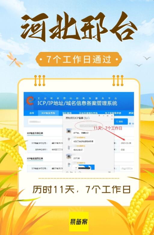 河北省的ICP備案需要多長(zhǎng)時(shí)間?我們今天做的這個(gè)客戶ICP備案通過用了7個(gè)工作日,刨除了兩個(gè)雙休日的時(shí)間。整體下來是11天,速度是挺快的。河北省的ICP備案速度有提升。