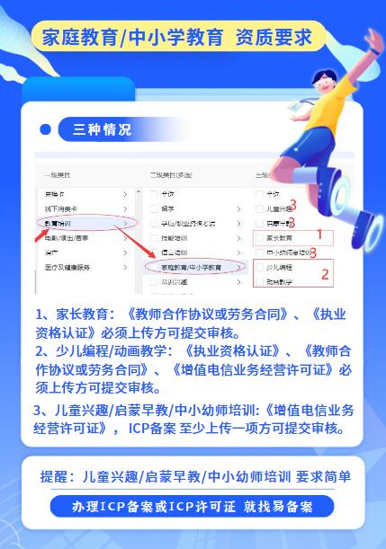 如果您入住這些類目,歡迎找我們辦理相關(guān)資質(zhì)。永易搜旗下易備案,專業(yè)做ICP備案和增值電信許可證。