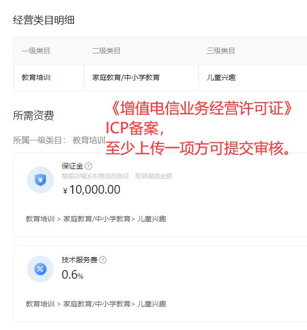我們在抖音的抖店入駐所需材料、費用頁面,找到了兒童興趣類目的要求細(xì)節(jié)。是要求提供:《增值電信業(yè)務(wù)經(jīng)營許可證》或 ICP備案,明確說明該類目需要上傳以下證件,《增值電信業(yè)務(wù)經(jīng)營許可證》, ICP備案 至少上傳一項方可提交審核。