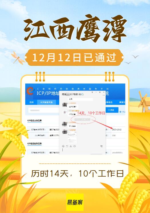 很多省份ICP備案的審核速度不是太快,比如江蘇、河北、江西。我們做的這個客戶用了10個工作日審核完畢,也算是還可以了的。全國大部分都是6個工作日,江西相對會慢一些了。