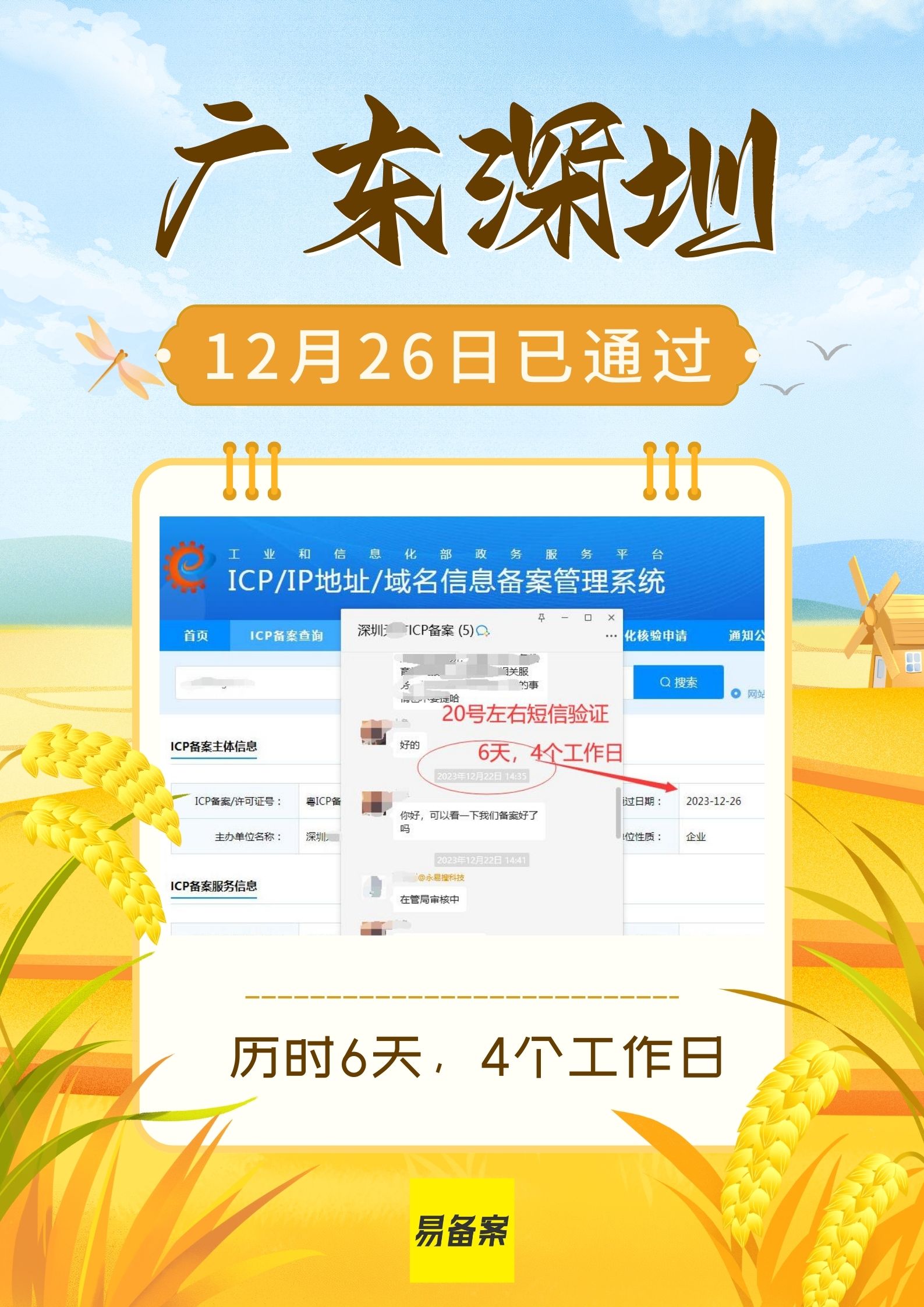 廣東省深圳市的客戶提交了ICP備案,4個工作日通過。是在2023年12月26日通過的。易備案給客戶提交備案,專業(yè)高效、速度快!幫客戶正規(guī)獲得備案,效率不是一般的高!