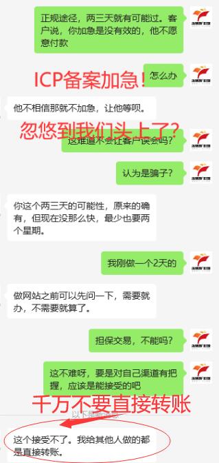 因?yàn)槟銜?huì)發(fā)現(xiàn)非常多的給你加急的人,是大忽悠。因?yàn)榉浅6嗟恼椅覀冏鰝浒缚蛻舴从尺^這個(gè)問題。今天剛好有一個(gè)人號(hào)稱自己可以快速備案,但聊了幾句基本就聽懂他的套路了。