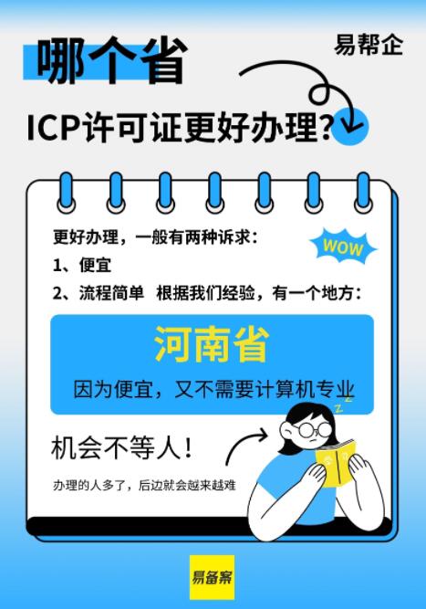 據(jù)目前來講,河南省做ICP許可證,還是更容易些的。雖然我們做全國的ICP許可證,但是河南省是相對比較容易的,要求低,審核速度也快,如果您所在的省份不好做,不妨在河南做一個公司,來進行辦理,就容易很多了。