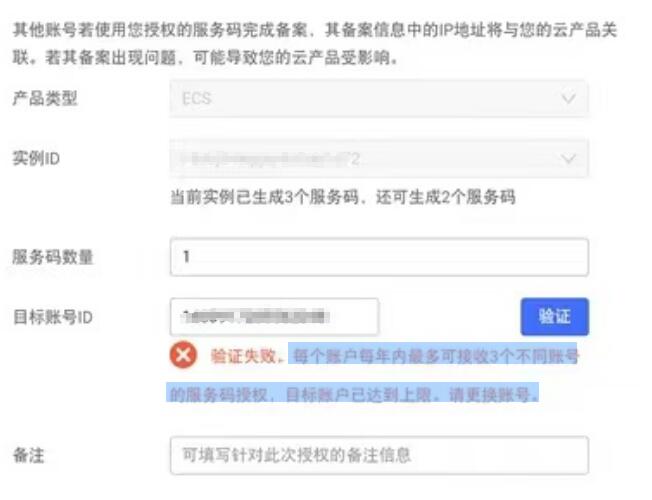 再給其他賬號(hào)進(jìn)行授權(quán)服務(wù)碼的時(shí)候,會(huì)遇到這樣的問(wèn)題:每個(gè)賬戶每年內(nèi)最多可接收3個(gè)不同賬號(hào)的服務(wù)碼授權(quán),目標(biāo)賬戶已達(dá)到上限。請(qǐng)更換賬號(hào)。