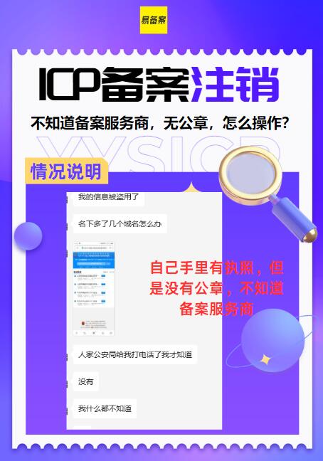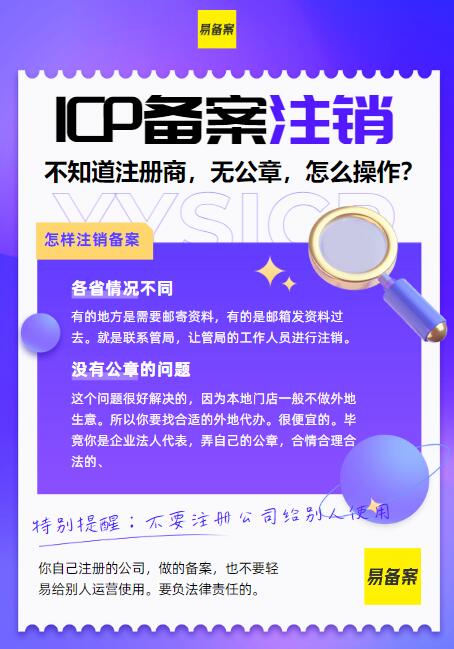 如果需要代辦可以找我們。聯(lián)系易備案:yysicp (加微信) 早點(diǎn)注銷,早點(diǎn)擺脫煩惱。另外也可以幫助你注銷掉不需要的營(yíng)業(yè)執(zhí)照。