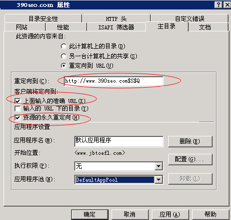 2、在“主目錄”選項卡中勾選“重定向到URL”,下邊填寫網(wǎng)址如http://bjsjjh.cn$S$Q,注意這個地方網(wǎng)址后邊不要加斜杠“/”