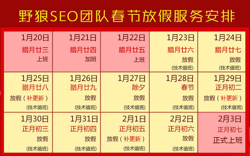 野狼SEO團隊定于臘月27到正月初六放假,臘月26補臘月24的單休,臘月27、臘月28、臘月29三天網(wǎng)站優(yōu)化更新工作安排到臘月28、正月初二、正月初五。