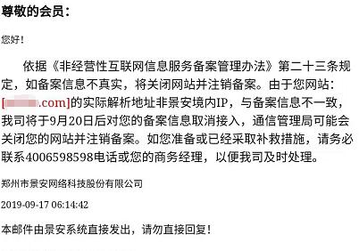 據(jù)部分客戶反映,昨天晚上收到景安群發(fā)郵件提醒:由于您網(wǎng)站:xxx的實(shí)際解析地址非景安境內(nèi)IP,與備案信息不一致,我司將于9月20日后對您的備案信息取消接入,通信管理局可能會關(guān)閉您的網(wǎng)站并注銷備案。如您準(zhǔn)備或已經(jīng)采取補(bǔ)救措施,請務(wù)必聯(lián)系4006598598電話或您的商務(wù)經(jīng)理,以便我司及時(shí)處理。