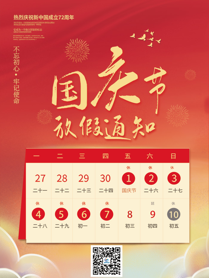 萬(wàn)里江山披錦繡,一腔熱血寄深情。1949年10月1日,偉大的中華人民共和國(guó)成立了,2021年國(guó)慶節(jié)是新中國(guó)成立72周年。2021國(guó)慶將至,在此,我們謹(jǐn)向全體員工、新老客戶致以節(jié)日的祝?!獓?guó)慶節(jié)快樂(lè)!