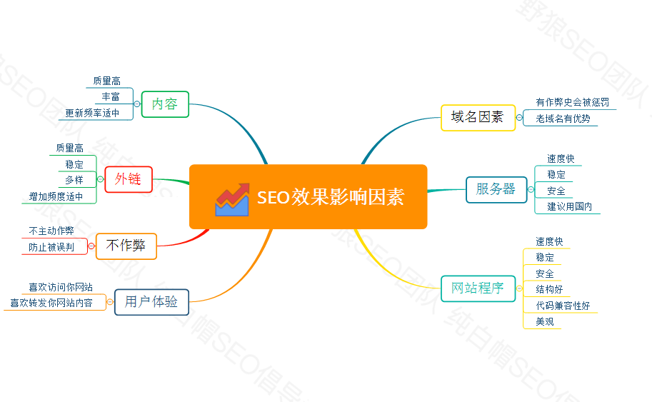 野狼SEO團(tuán)隊(duì)經(jīng)常會發(fā)一些SEO方面的知識,但是很多人沒有耐心給文字看完,所以以后就盡可能圖文并茂的來描述問題。上邊的圖是不是一下子就看的很清晰了呢?對于一個(gè)網(wǎng)站來講,影響他排名的因素很多,比如我們總結(jié)的七大影響因素: