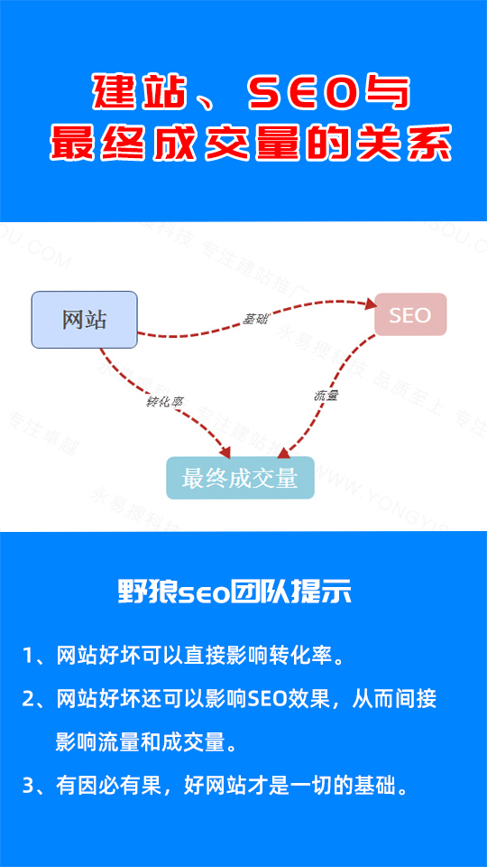 很多人都知道網站做的好,可以讓更多人看到網站之后心動然后跟你聯(lián)系。但往往不知道其中的原因,而且特別是不知道SEO與建站和成交量之間的關系。那么今天野狼SEO團隊就把這個問題說透徹。看下圖: