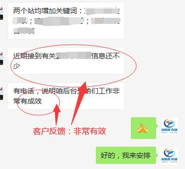 合作多年的客戶了,多個網(wǎng)站都在我們這里做優(yōu)化。最近安排增加關(guān)鍵詞,并且反饋給我們:接到xxx相關(guān)的信息還不少,有電話,說明咱后臺兄弟們工作非常有成效。野狼SEO團(tuán)隊,所有的案例真實有效,歡迎驗證。